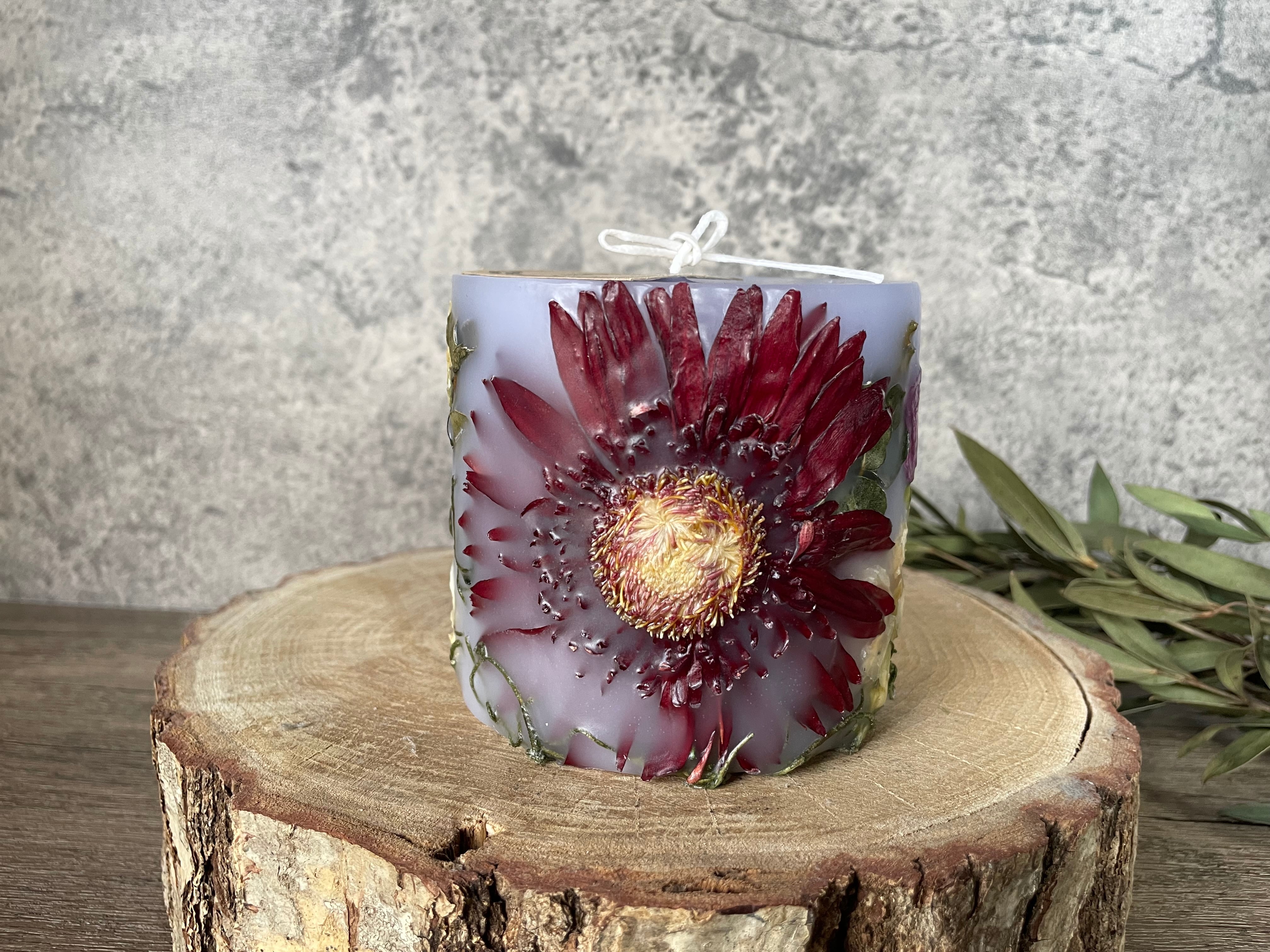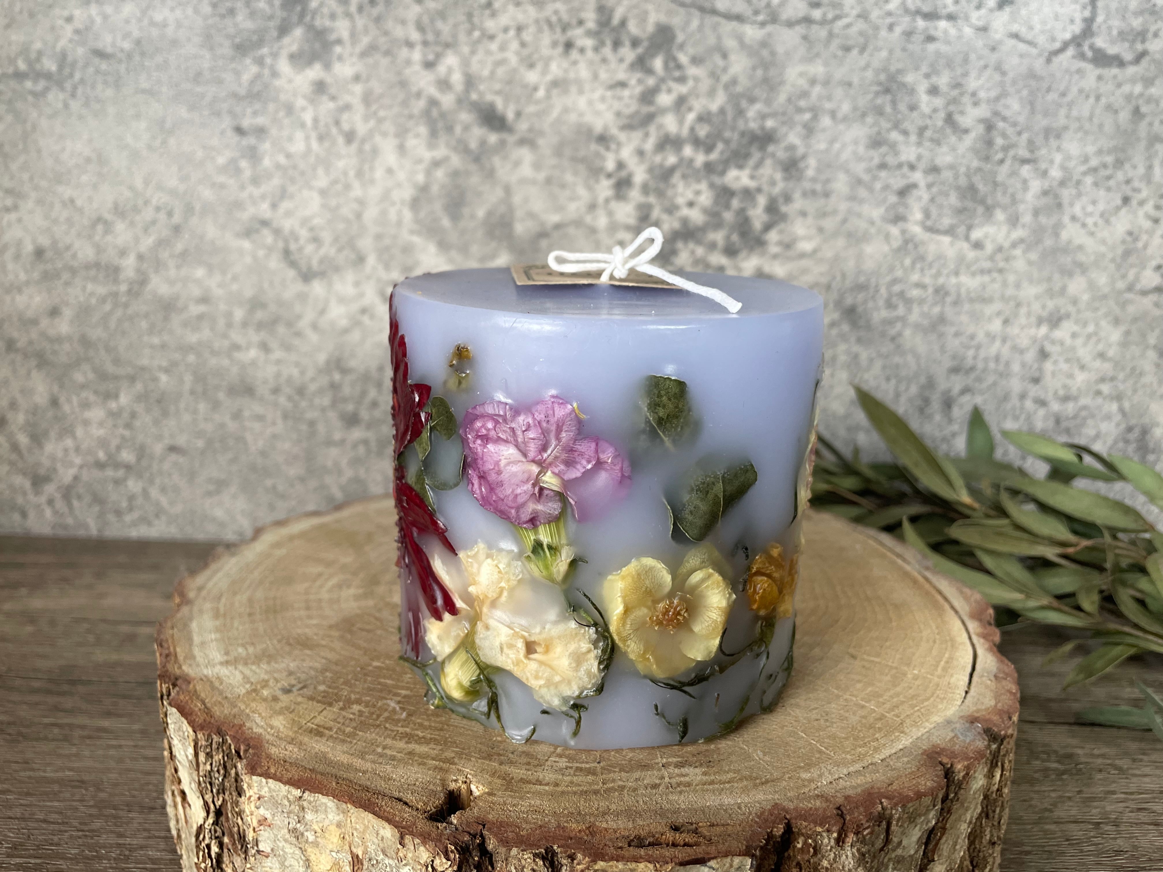 生花をドライフラワーに加工し、キャンドルの中に美しく詰め込みました。灯すと内側から優しい光が溢れ出し、お部屋を温もりで包み込みます。